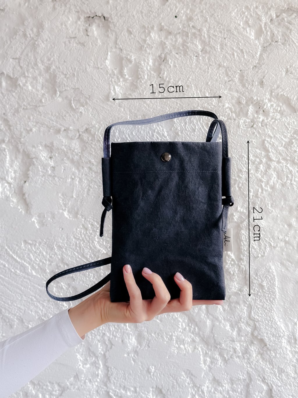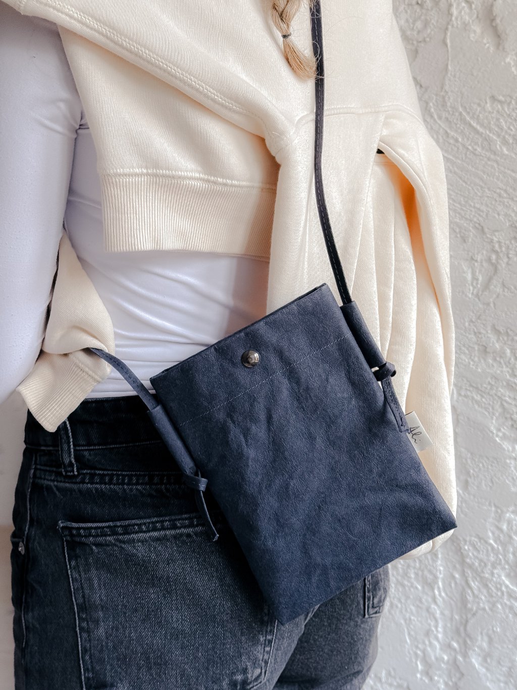 Malá dámská kabelka, taštička, kapsička vyrobená z pratelného papíru, přes rameno nebo jako messenger. V horní části je magnetické zapínání. Můžete do ní dát nejnutnější (mobil, klíče, malou peněženku) a jít jen tak na lehko. Popruhem je šňůra vyrobená ze stejného materiálu jako taštička.