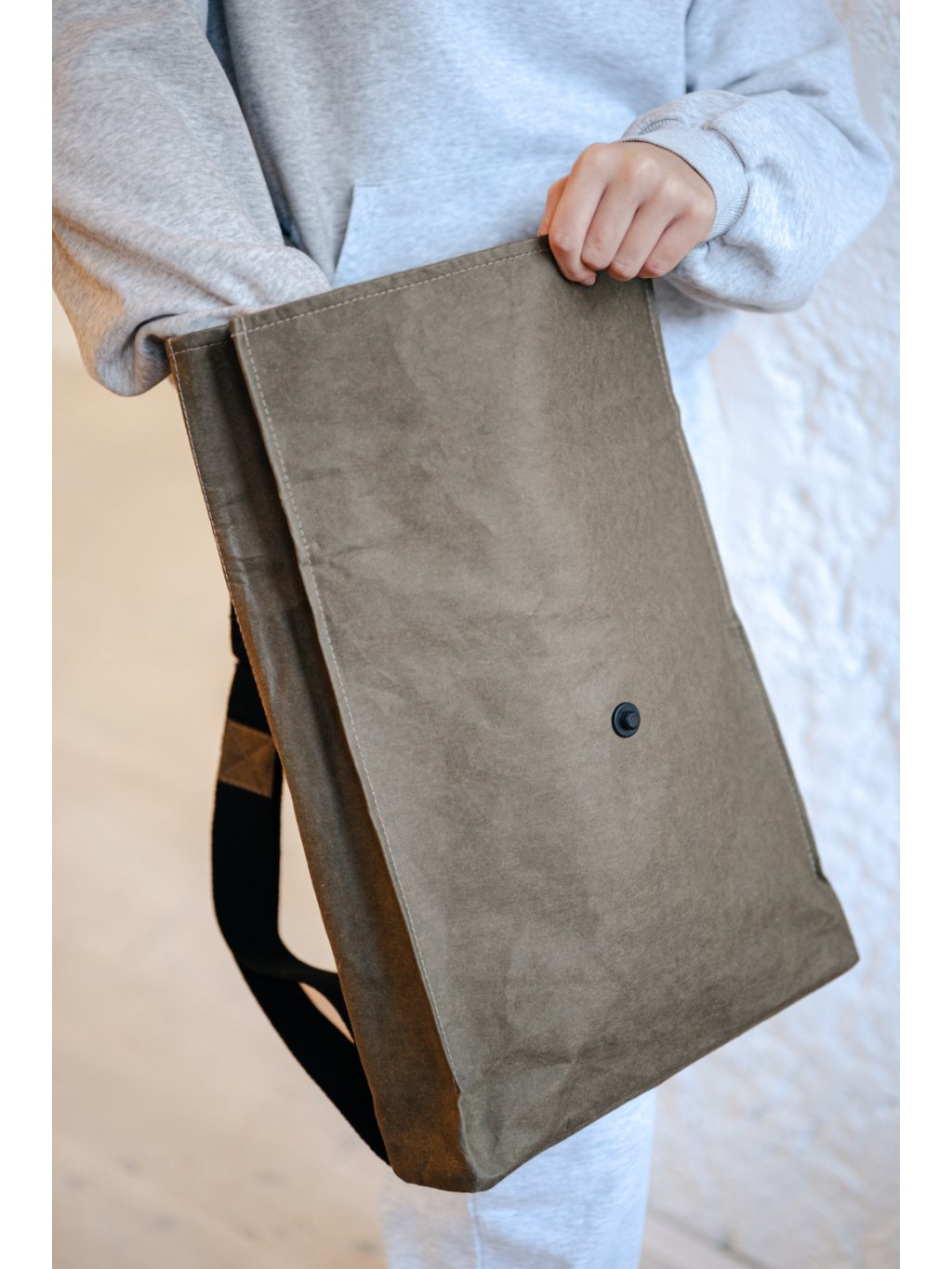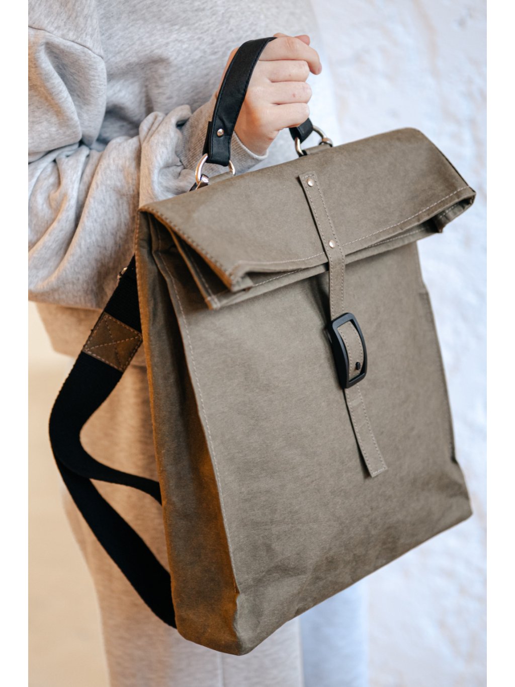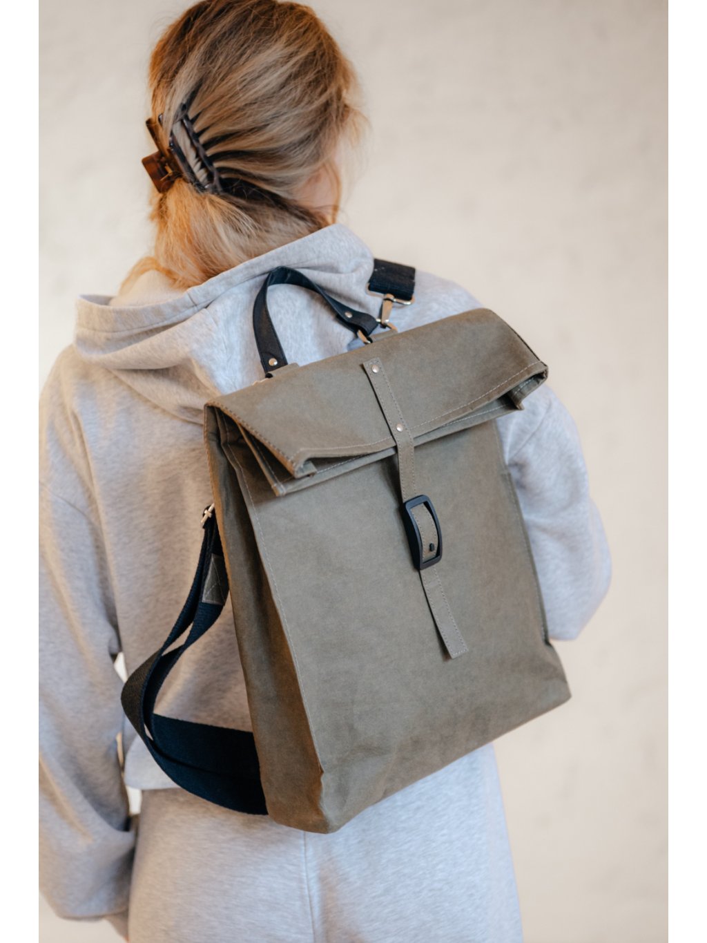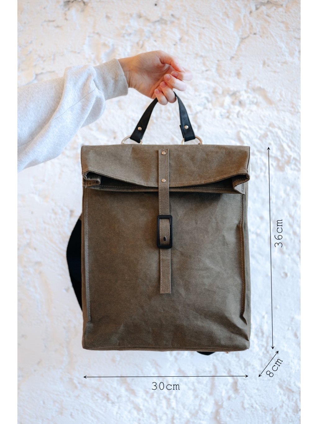 Batoh je vyroben z ekologického materiálu pratelný papír, jiným názvem Snappap, washpaper, washable paper, Kraft tex nebo veganská kůže, více se dozvíte ZDE