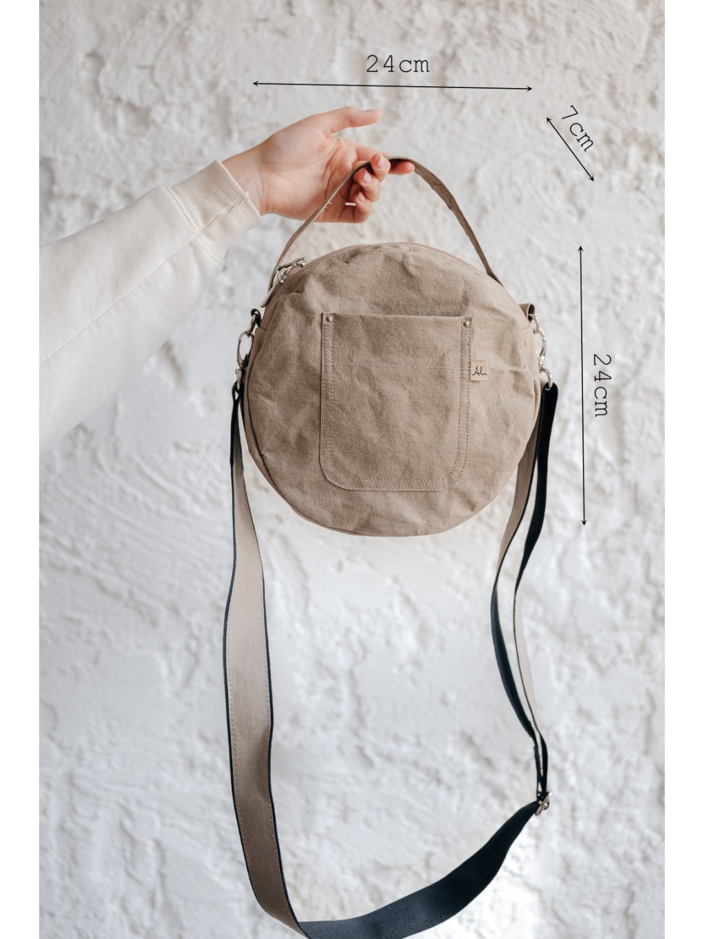 Kabelka se uzavírá na zip, takže vaše osobní věci zůstanou bezpečně uložené. Na přední straně najdete praktickou kapsu pro rychlý přístup k telefonu nebo klíčům. Vnitřní prostor je bez podšívky, což podtrhuje její čistý a přirozený design. Nastavitelný bavlněný popruh s délkou až 140 cm umožňuje přizpůsobit nošení přesně podle vašich potřeb.