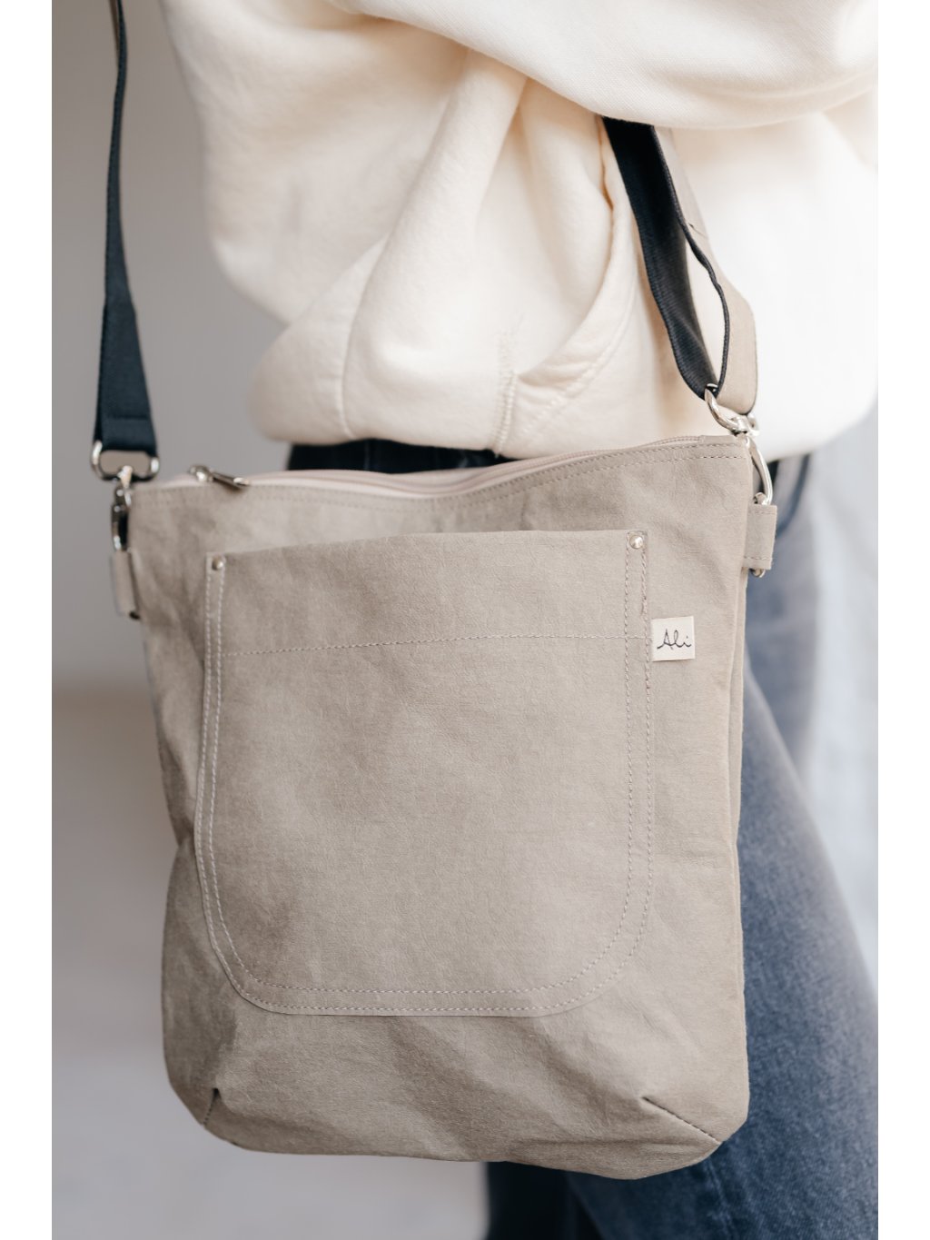 Kabelka KLÁRA z pratelného papíru přední kapsa slonová kost tmavá
