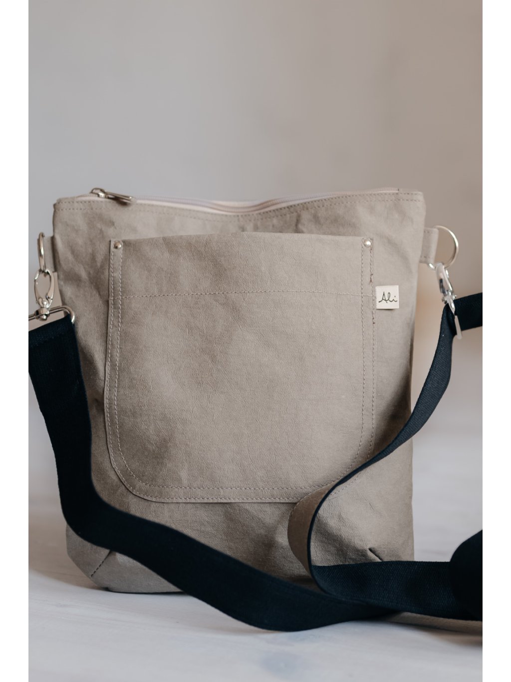 Kabelka je vyrobena z ekologického materiálu pratelný papír, jiným názvem Snappap, washpaper, washable paper, Kraft tex nebo veganská kůže, více se dozvíte ZDE